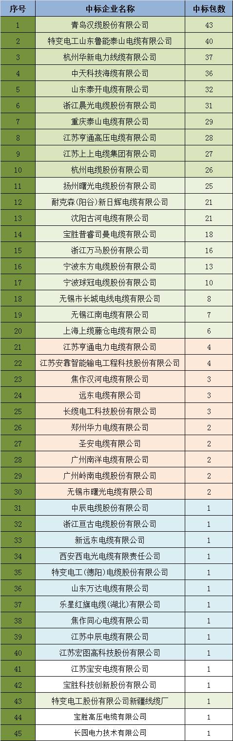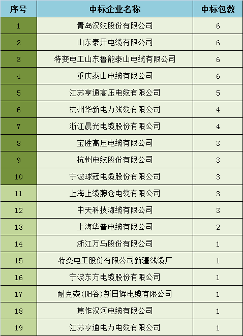 前十家电力电缆企业中标包数占总数的64%,分别是青岛汉缆股份有限公司、特变电工leyu乐鱼online(中国)鲁能泰山电缆有限公司、杭州华新电力线缆有限公司、中天科技海缆有限公司、leyu乐鱼online(中国)泰开电缆有限公司、浙江晨光电缆股份有限公司、重庆泰山电缆有限公司、江苏亨通高压电缆有限公司、江苏上上电缆集团有限公司、杭州电缆股份有限公司。