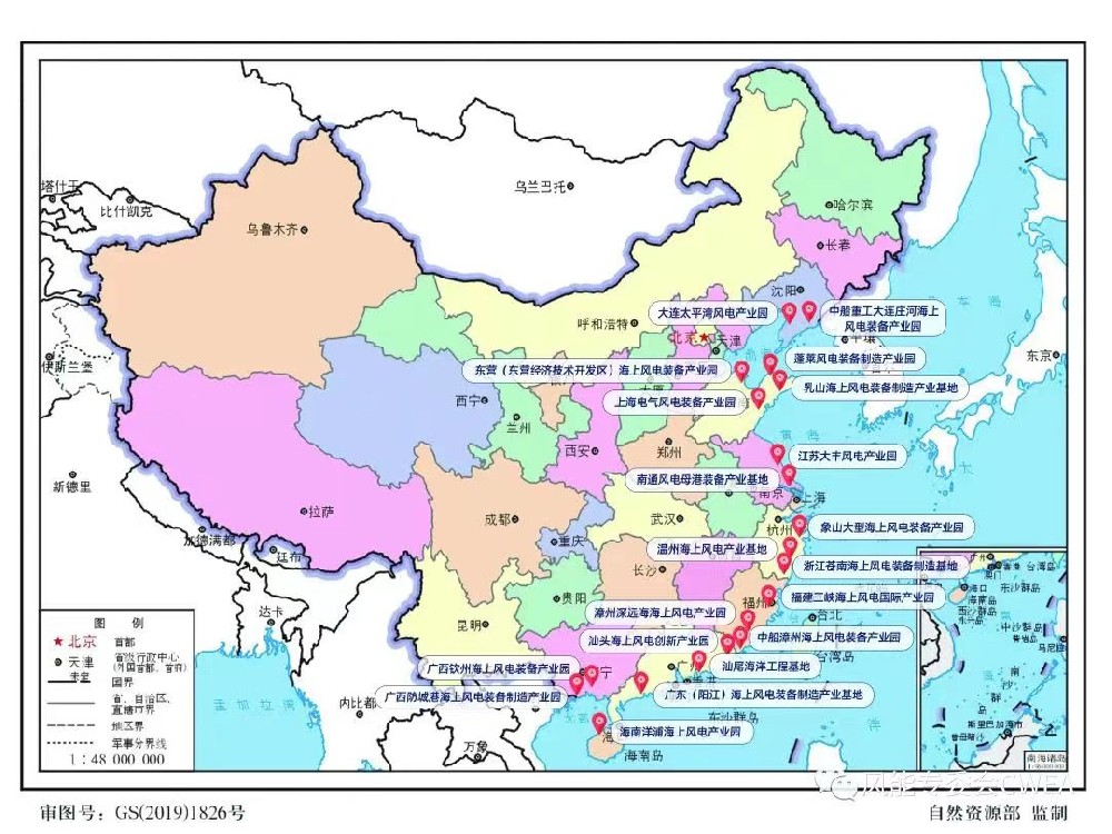 过去三年,中国海上风电规模从7GW发展到了30GW,占据了全球近50%的市场份额。其中贡献最大的是风电装备制造商,他们实现了海上风机从6兆瓦到18兆瓦的跃迁,不断推陈出新的大型机组让海上风电的造价下降了50%,推动去补贴后的中国海上风电高质量健康发展。同时,地方政府对风电装备产业支持力度明显增大。浙江、福建、广东、海南等省在政府工作报告中明确提出,对风电装备制造业进行链条式培育,集群式发展。宋固等人梳理了国内20家主要的海上风电装备产业园/基地的总体情况,对其地理位置、占地面积、预计总投资额、主要入驻企业等关键信息进行了列表汇总,并绘制了我国主要海上风电装备产业园/基地分布图。
