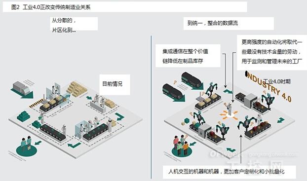 波士顿咨询公司发布报告介绍了工业4.0时代的九大技术趋势,并探讨其潜在的技术和经济效益,为制造商和生产设备供应商提供信息。这九大技术进步已应用于制造业,而随着工业4.0的到来,它们将改变生产方式:独立和优化的单元将完全整合为自动化的生产流程,改变供应商、生产商和客户之间的传统关系,也改变了人和机器之间的关系。(图2)