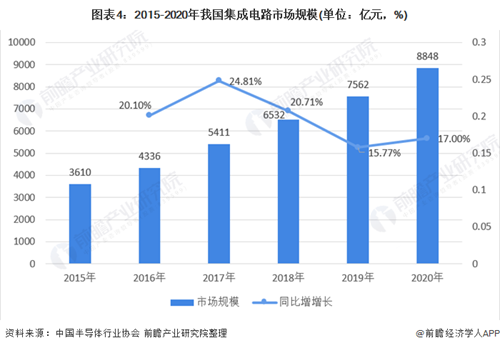 根据中国半导体行业leyu乐鱼online(中国)数据显示,2015-2020年我国集成电路市场规模呈逐年增加趋势。2020年我国集成电路市场规模为8848亿元,较2019年增加17.00%。