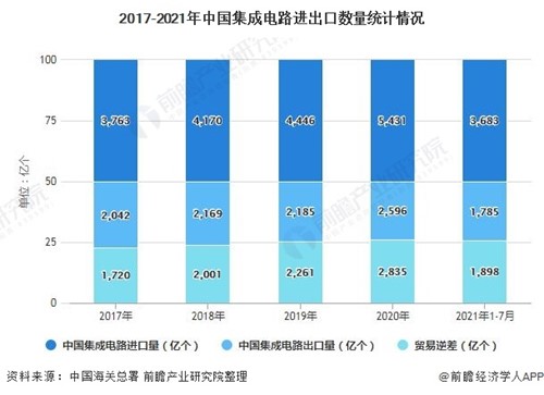 截止至2021年7月,我国累计进口集成电路3683亿个;出口集成电路1785亿个,贸易逆差为1898亿个。